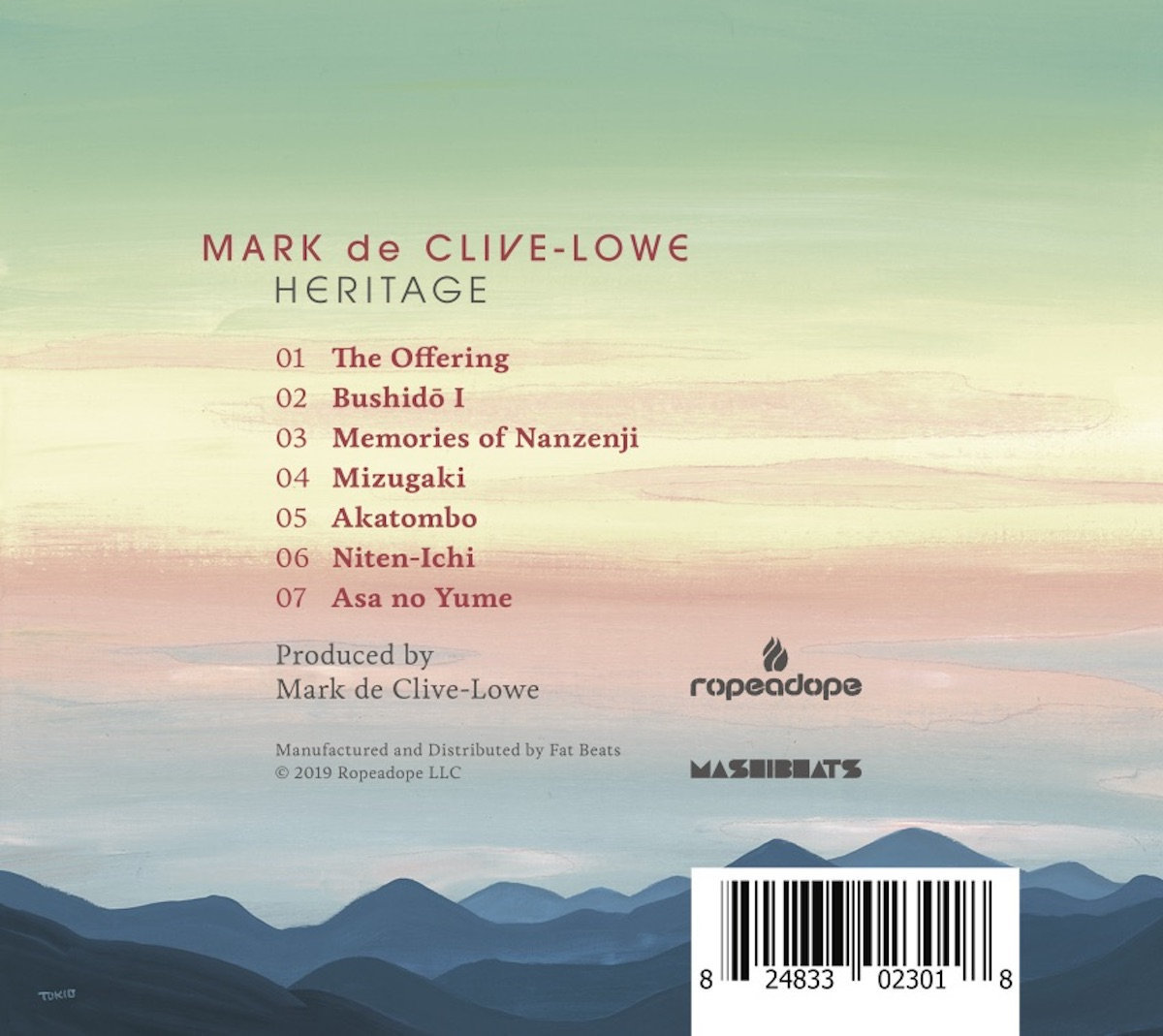 All compositions by M. de Clive-Lowe (Mashibeats/Songs of Defend) except “Akatombo” (trad., arr M. de Clive-Lowe), “Asa no Yume” by M. de Clive-Lowe (Mashibeats/Songs of Defend) / B. E. Owens (Eugenepusher ASCAP) / J. Johnson (Sky and City Music BMI)