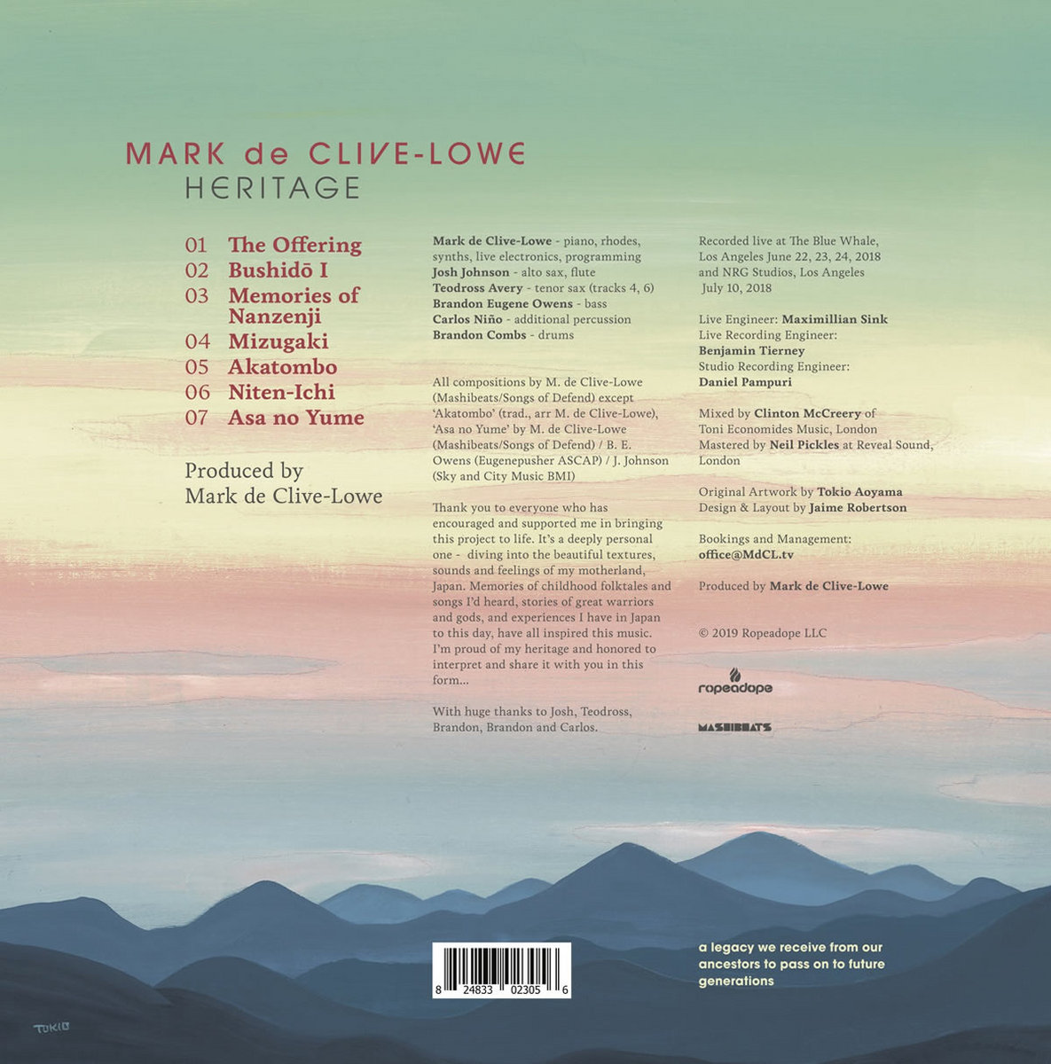 HERITAGE is the first installment of the new two-album series from pianist, composer and live remixer Mark de Clive-Lowe. For the half-Japanese half-New Zealander, these two albums (his 15th and 16th albums respectively) are by far his most personal work yet - deep diving into his Japanese ancestry and cultural roots through the lens of jazz, electronica and beats in collaboration with his LA band of world-class musicians - Josh Johnson (Leon Bridges/Esperanza Spalding), Teodross Avery (Talib Kweli/Mos Def), Brandon Eugene Owens (Terrace Martin/Robert Glasper), Brandon Combs (Moses Sumney/Iman Omari) and Carlos Niño (Build An Ark/Lifeforce Trio).